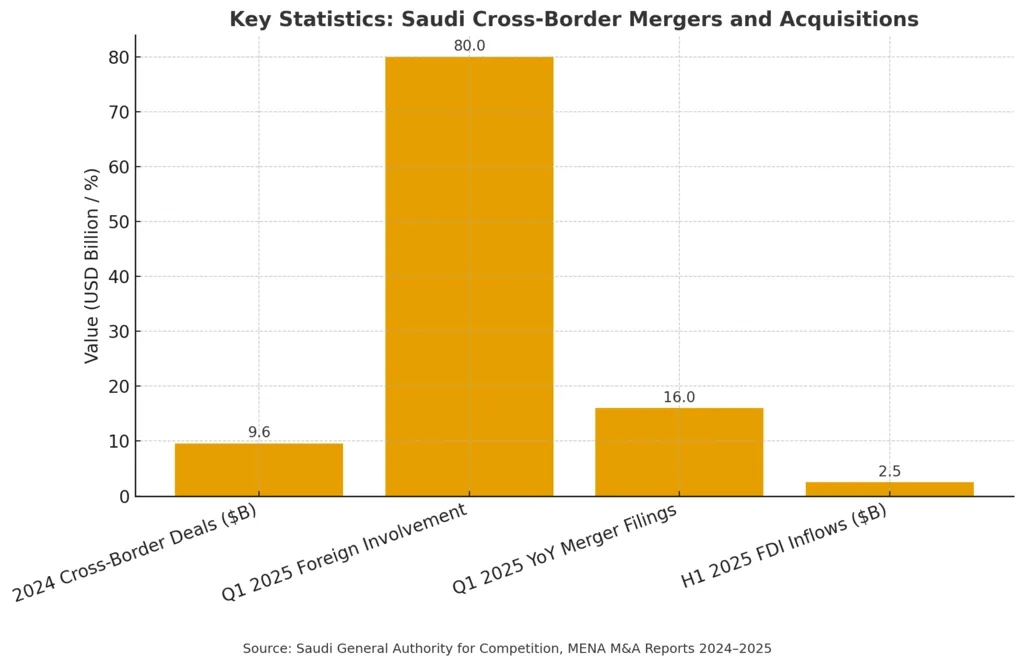 Saudi Arabia is becoming a focal point for global investors. In Q1 2025, 80% of merger and acquisition (M&A) transactions in the Kingdom involved at least one foreign entity. This reflects a surge of international interest in the Saudi market. The flow of Saudi Cross-Border Mergers and Acquisitions is shaping a new investment landscape.