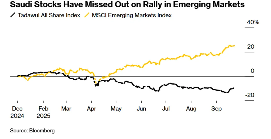 The reform comes at a time when Saudi Arabia’s main index on Tadawul is down 9.6% year-to-date, making it the worst performer in the Gulf region. In contrast, the MSCI Emerging Markets benchmark has surged 25% in dollar terms.