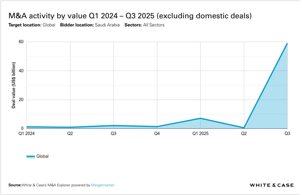 The defining transaction behind Saudi Arabia’s outbound M&A surge this quarter is the US$55 billion acquisition of Electronic Arts (EA) by a consortium led by the PIF alongside Silver Lake and Affinity Partners. This historic all-cash deal and the largest sponsor-led take-private in history – underscores Saudi Arabia’s ambition to become a global force in digital entertainment. With PIF rolling over its existing stake, the deal reflects a deepening commitment to gaming and interactive media as part of the Kingdom’s outbound M&A strategy.